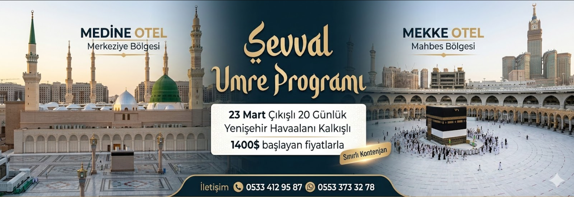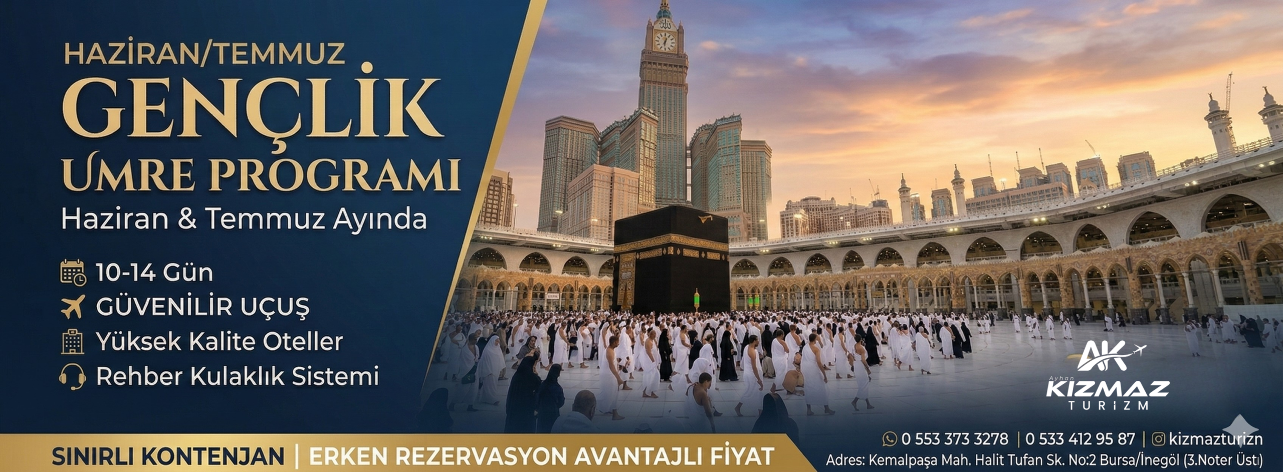 Hac ve Umre ibadetlerinizi huzur, güven ve konfor içerisinde gerçekleştirebileceğiniz organizasyon seçenekleri sunuyoruz. Kutsal topraklara yapacağınız manevi yolculuğun her aşamasını profesyonel şekilde planlayarak ibadetlerinize odaklanmanızı sağlıyoruz. Kutsal mekânlara yakın konaklama seçenekleri, konforlu ulaşım hizmetleri ve deneyimli rehber desteği ile yolculuğunuz boyunca yanınızdayız. Hac ve Umre sürecinde vize, bilet, transfer ve organizasyon detayları titizlikle takip edilir.